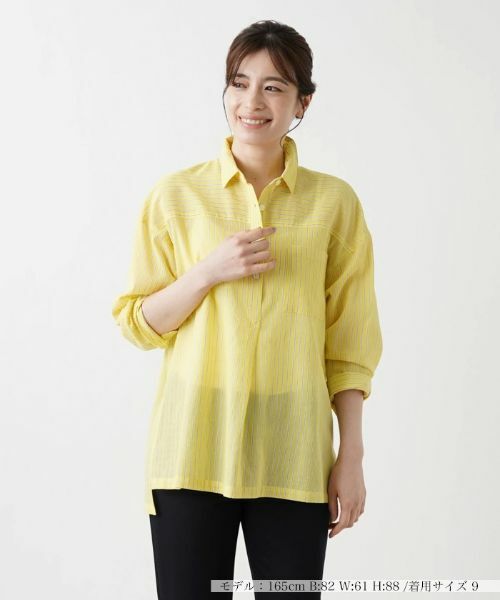 爽やかなストライプ柄を表現した、ハーフプラケット仕様のチュニックブラウス。薄手のナチュラルな風合いのコットン生地を使用し、これからの季節にふさわしい涼やかな着心地を実現しました。バックヨーク下に配されたタックから美しく広がるシルエットが印象的で、動くたびに優雅なラインを描きます。裾にはサイドスリットを入れて前後差を加えており、身体のラインを拾いにくく、ヒップまでしっかりと隠れる着丈で体型カバーも手軽に行えます。カジュアルなデニムやエレガントなスカートとも相性がよく、一枚でコーディネートの主役になれるアイテムです。