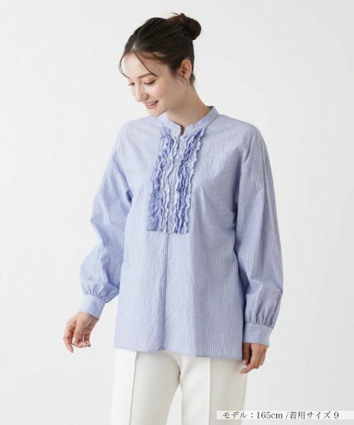 胸元に立体的なフリルを飾ったバンドカラーブラウス。爽やかさを引き立てるストライプをベースに、ほんのり甘さをプラスしました。ドロップショルダーでゆとりをもたせたリラックスシルエットが、肩肘張らない快適な着心地を実現します。さりげないフェミニンムードを演出しつつ、カジュアルなシーンでもフレキシブルに活躍してくれそうな一枚。ワイドパンツなどのリラクシーなボトムスとも相性抜群で、多彩なコーディネートを楽しめるアイテムです。