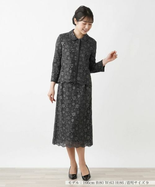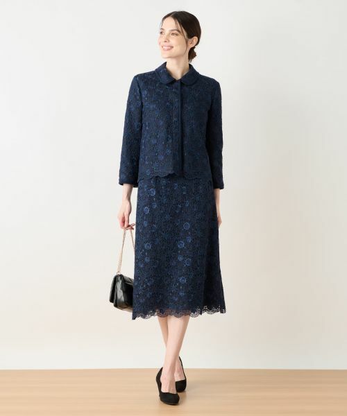 レースを使用した高級感のあるスーツです。レースの上糸にコットン糸とレーヨン糸を使用し、光沢とマットな部分が程よく混ざり合うことで立体的な花柄を表現しています。下地にはチュールを使用しているので軽やかなイメージに仕上げています。ジャケットのショールカラーの襟元にウールのブレードテープをトリミングし、きちんとした印象に。スカートの裾は、レースのスカラカットを効かせた優しいデザインにしています。