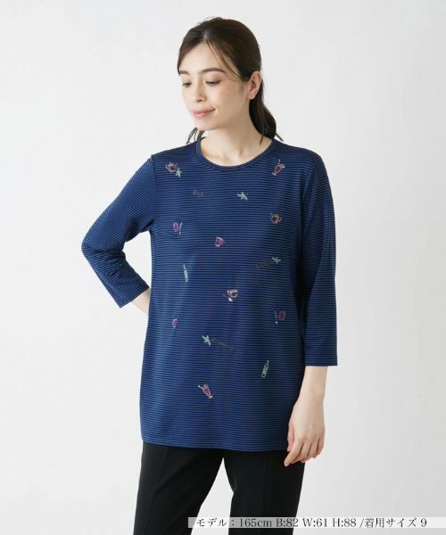 シンプルなナローボーダーを背景に、ユニークな刺繍を施した遊び心溢れるデザインのプルオーバー。スパンコールの煌めきがさりげないアクセントになり、ひと味違った表情を作り出しています。ネックラインはすっきりと開きをもたせ、ヘルシーなデコルテ見せを演出。クロップドスリーブで軽快な印象に仕上げ、ジャストシーズンのカジュアルなスタイリングを後押しします。定番のパンツルックはもちろん、フェミニンなスカートともマッチする着回し力に優れたアイテムです。