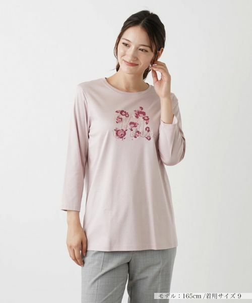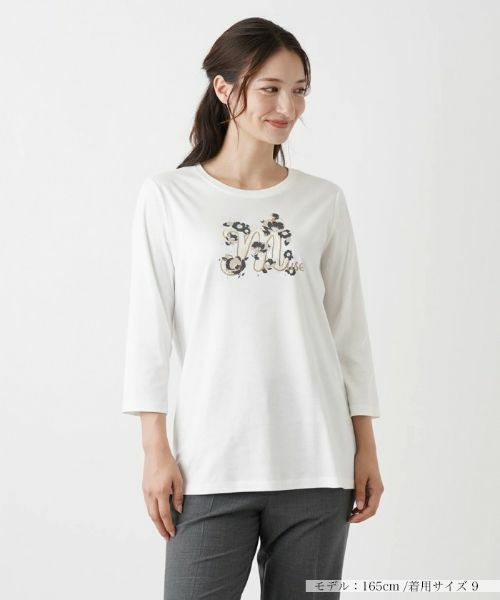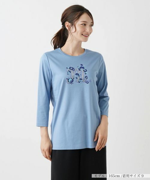 スパンコールやラインストーンを散りばめたイニシャルロゴが目を惹く、クロップドスリーブカットソー。ロゴの周囲は花々が咲き誇り、季節感溢れる華やかな雰囲気を漂わせています。やや薄手のコットン生地を使い、シルエットには程よくゆとりをもたせ、リラクシーな着心地を叶えました。ボトムスはパンツ、スカートを問わずに合わせやすく、多彩なコーディネートで楽しめそうなアイテムです。