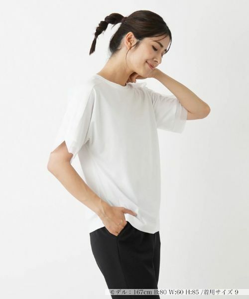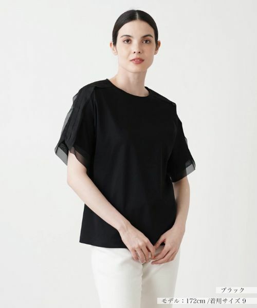 微細な光沢を湛える上品な風合いのコットン生地で仕立てたクルーネックカットソー。ネックラインは浅めに設定し、清楚な女性らしい佇まいを演出。ショルダーからスリーブ、袖口の異素材切り替えが絶妙なアクセントに。袖口周りはシアーな素材感が際立ち、季節らしい涼やかなニュアンスに仕上がります。落ち着いたシックな色合いでまとめているのでボトムスともコーディネートしやすく、オンオフのシーンを選ばずに使えるので着回し力に優れています。