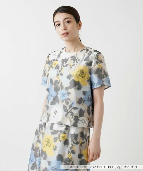 ほんのりと浮かぶオブスキュアなフラワー柄の織模様が、さりげなくセンスを引き立てる半袖ブラウス。ほのかな光沢を湛える美しい風合いの生地が、コーディネートに華やかさを添えてくれる一枚。やや短めの着丈なのでミモレスカートやワイドパンツとの相性も抜群で、バランスのよいスタイリングが楽しめます。シルエットには程よくゆとりを持たせているため、さらりと着るだけでリュクス感溢れる旬の着こなしが完成します。バックファスナーにより着脱が可能。------------------------------------着用シーズン:夏伸縮性:なし透け感:身頃:なし、スリーブ:ありポケット:なし生地の厚さ:やや薄手裏地:身頃:あり、袖:無し-------------------------------------※商品の色味は、撮影場所や光のあたり具合、お客様のお使いの機器により色味が違って見える場合がございます。予めご了承ください。家庭洗濯不可漂白不可タンブル乾燥不可アイロン低温120℃までドライクリーニング可ウェットクリーニング不可