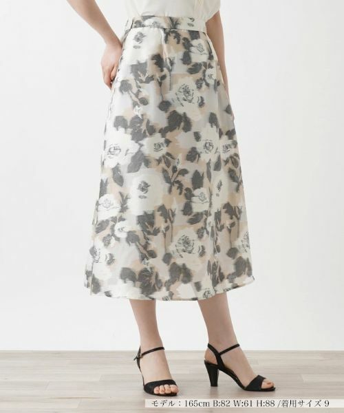ほんのりと浮かぶ水彩画のようなフラワー柄の織模様が、さりげなくセンスを引き立てるフレアスカート。ほのかな光沢を湛える美しい風合いの生地が、コーディネートに華やかさを添えてくれる一枚。淡いカラーリングでシーズンらしい明るさをキャッチしているから、白いブラウスを合わせてフレッシュ&エレガントに楽しみたいところ。シルエットには緩やかに広がりをもたせているため、軽やかな印象に仕上がり、リュクス感溢れる旬の着こなしが完成します。バックはホック&ファスナーにより開閉が可能。