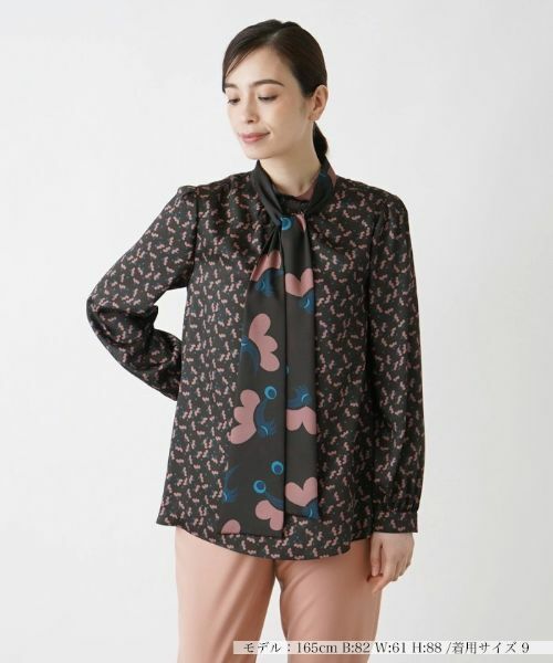 アーティスティックな柄が目を楽しませるボウタイブラウス。大胆でボリューム感たっぷりのボウタイが視線を惹きつけ、他にはないインパクトを放ちます。さらりとした風合いの薄手の生地を使用し、肩肘張らないリラクシーなシルエットで仕立てました。個性的でありながらもエレガントなスタイルを演出し、デイリールックに彩りと個性をプラスしてくれる一枚。パンツやスカートとの相性もよく、様々なシーンで活躍すること間違いなしです。バックはボタン&ファスナーにより着脱が可能。
