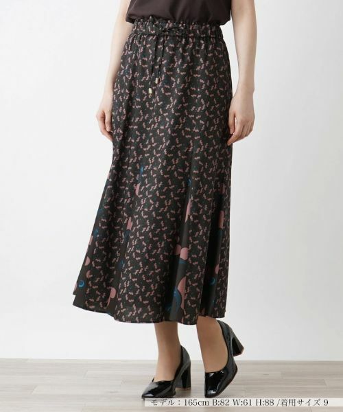 アーティスティックなフラワー柄をプリントした、ロング丈のフレアスカート。巧妙に柄を切り替えることで変化をもたせています。ふわりと広がるシルエットでナチュラルなドレープ感があり、優しげなフェミニンムードを演出。ウエストは総ゴム仕様で心地よくフィットし、ドローコードにより調整も行えます。バックはホック&ファスナーにより開閉が可能。タックインすれば脚長見せのスタイルアップ効果も狙えそうです。気軽にコーディネートしやすく、お揃いのトップスと合わせるのもおすすめです。