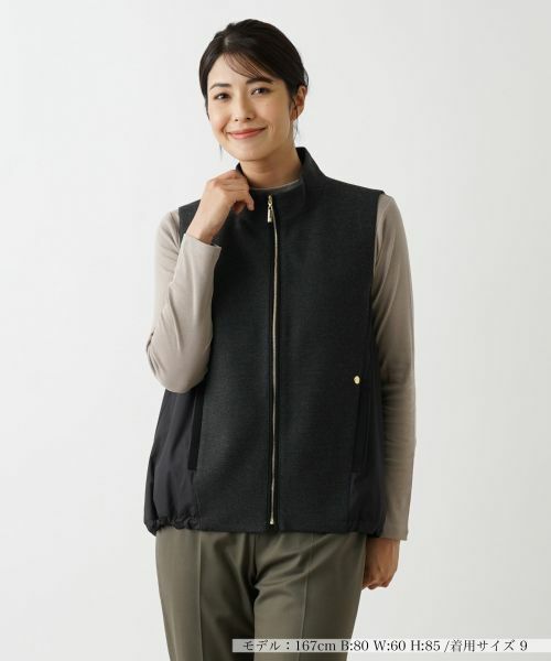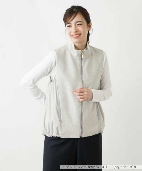 心地よい軽やかさと適度な保温性をキープする、カジュアルな中わた入りのハイネックベスト。フロントはジップアップ仕様でスムーズに着脱が可能。後ろ身頃は巧みに素材を切り替え、ふんわりとしたボリューム感のあるシルエットでデザインしています。統一感のある色使いでインナーやボトムスともコーディネートしやすく、上級者らしい着こなしを手軽に楽しめるアイテムです。裾はドローコードにより調整が可能。