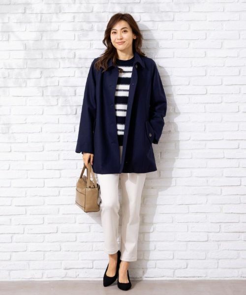 やや厚手の素材で仕立てられたステンカラーハーフコートは、季節感溢れる温かさと上品さを兼ね備えた一着です。落ち着いたシックな色合いでインナーやボトムスとも相性がよく、気負わずにスタイリングできるのが魅力。フロントのウエスト両サイドにポケットをレイアウトし、実用性とデザイン性を両立。さらにマーブルボタンを採用し、袖口や襟裏にはチェック柄をあしらい、細部にまでこだわりを感じさせる仕上がりに。カジュアルにもオフィスにも対応する汎用性の高いアウターです。
