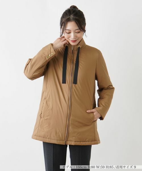 程よくボリュームを抑えつつ、キャメルの中わたを詰め込んだ、保温性抜群のスタンドカラーショートコート。ベーシックな無地で、オンオフ問わず幅広いシーンで活躍する汎用性の高いアウターです。フロントはフルジップ仕様でしっかりと閉じられ、冷たい風をしっかりシャットアウト。襟には太めのドローコードが付いており、フィット感を自由に調整できるのも魅力です。ウエスト内側にはラクダモチーフの刺繍テープを施してさりげないアクセントに。袖口はスナップボタンで開閉が可能です。