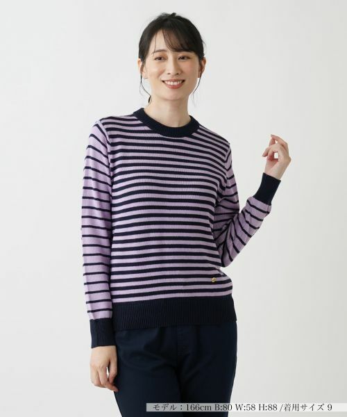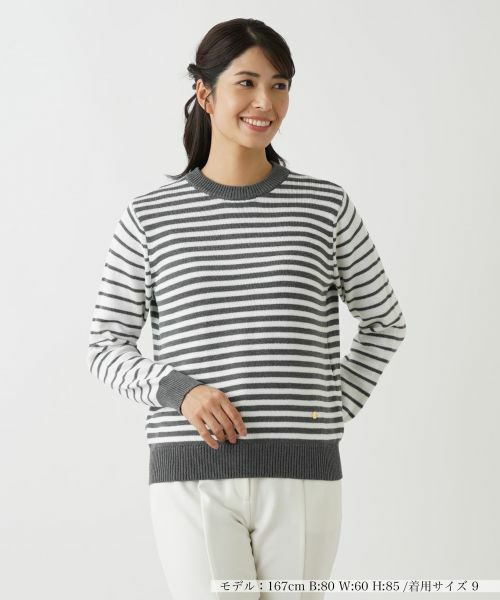 身頃と袖で異なるピッチのボーダーが、シンプルながらもスタイリングに奥行きをもたらすクルーネックニット。ネックラインは浅めに設定し、顔周りをすっきりと見せるシルエットが特徴。上質なコットンをハイゲージで丁寧に編み上げており、柔らかく上品な温もりが感じられる一枚です。フロント左裾付近にロゴ入りのラウンドプレートをあしらい、さりげないアクセントに。ジャケットやコートとのレイヤードスタイルにも相性抜群でオンオフ問わず幅広いシーンで活躍してくれます。