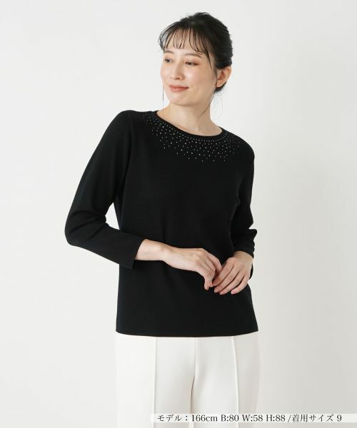 ネック周りに夜空の星々のように煌めくラインストーンを散りばめた、華やかな印象のニットプルオーバー。すっきりとしたシルエットで、様々なインナーやボトムスと合わせやすく、デイリースタイルに気軽に取り入れられます。ベーシックな定番のパンツでシンプルにまとめるのはもちろん、フェミニンなスカートと合わせることで上品な華やかさが引き立ち、多彩なシーンで活躍してくれそうな一枚です。