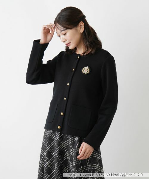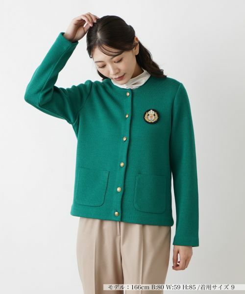 上品な色合いでデザインした、すっきりとしたシルエットのノーカラージャケット。左胸に施されたワッペンがアクセントを加え、存在感のあるエンブレムボタンがクラシカルなエッセンスをプラス。前ウエスト部分には小ぶりのパッチポケットをレイアウト。クリーンな印象でさまざまなスタイルにマッチし、パンツでまとめたシックな着こなしはもちろん、フェミニンなスカートと合わせればエレガントかつモダンなコーディネートを楽しめます。