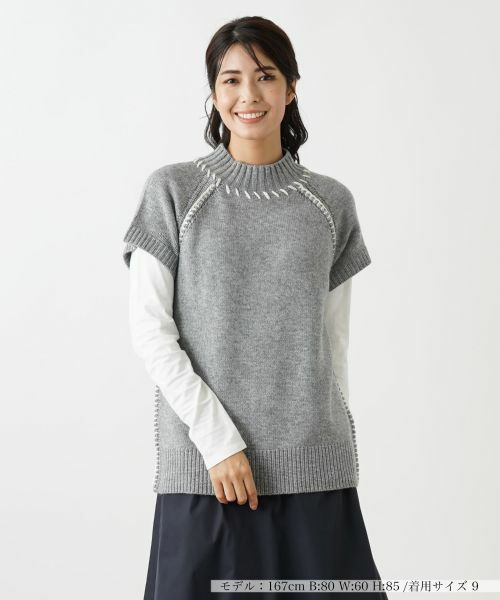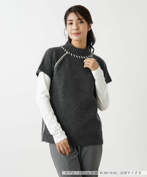 落ち着いた色合いのハイネックニットベスト。ショルダーラインを覆うゆったりとしたシルエットが印象的。やや厚手のニットが優しい温もりを伝えます。ネック周りや袖、身頃サイドに施された、配色のステッチハンド刺繍が存在感のあるユニークなアクセントに。すっきりとした細身のパンツでシンプルにまとめるのはもちろん、フェミニンなロングスカートを合わせたコーディネートとも好相性。