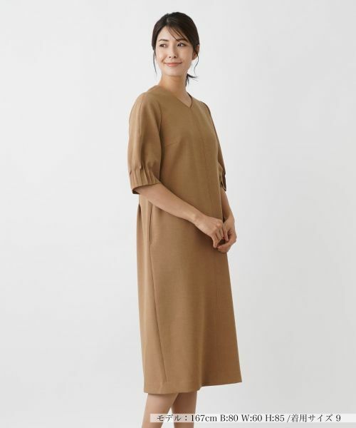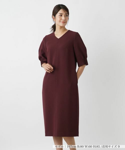 ゆったりとしたボリュームスリーブが女性らしいムードを漂わせる膝丈のサックワンピース。ワイドに開いたネックラインがデコルテを覗かせ、ヘルシーな魅力を引き立てます。さらりとしたやや薄手の生地を使用しており、後ろ裾にはスリットを入れ、スムーズな足捌きにも配慮しています。体のラインを拾いにくく、ヒップまで隠れるので体型カバーもお手のものです。バックファスナーにより着脱が可能。