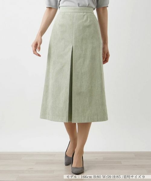 滑らかなコーデュロイ素材を使用した、端正なAラインシルエットのミモレ丈スカート。ウエストをシェイプしつつ、裾に向かって広がりをもたせ、フロントにインバーテッドプリーツを施すことで美しいシルエットを作り出しています。ウエストには伸縮性をもたせているので心地よくフィット。バックはスナップボタン&ホック、ファスナーにより着脱が可能。同素材のトップスとセットアップでコーディネートするのもおすすめです。