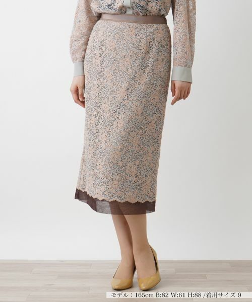 透け感のあるボタニカルレースで仕立てたミモレ丈のタイトスカート。中地には異素材を重ね、レイヤード風の仕上がりに。バックウエストはゴム仕様で心地よくフィット。ヒップやレッグラインがすっきりと際立つ美しいシルエットも相俟って大人エレガントな佇まいを演出。コーディネートは同素材のトップスとのセットアップもおすすめ。トップスをタックインすれば脚長見せのスタイルアップ見せ効果も狙えそうです。