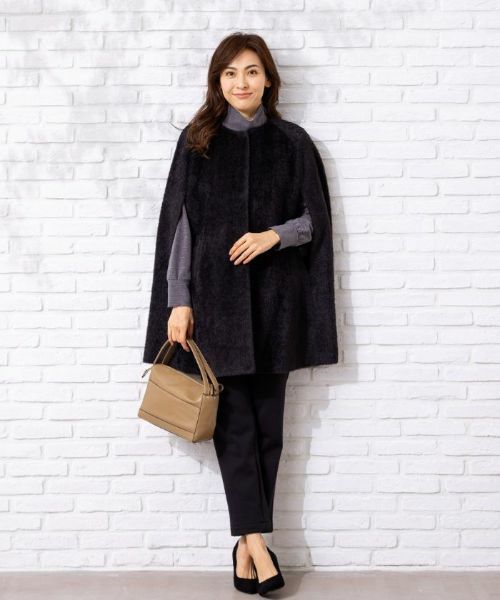 毛足のあるファーのような素材で仕立てられた、ケープ風のコート。柔らかな質感が心地よく、シーズンムードを一気に高めてくれる一着です。フロントはスナップボタン仕様で、スムーズに開閉が可能。ヒップを覆う丈感が、体型をナチュラルにカバーしつつ、シルエットに品のよいボリューム感をプラス。落ち着いたシックなカラーリングでコーディネートにも取り入れやすく、カジュアルからエレガントまで幅広いスタイルにマッチします。