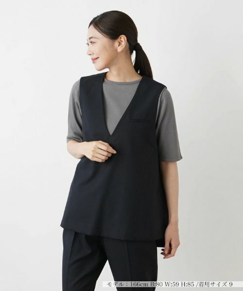 やや薄手のシャドーストライプ生地で仕立てたVネックベスト。シャープなネックラインが着こなしをスマートに演出。裾にはサイドスリットを入れ、絶妙なバランスの抜け感を作り出しています。左胸部分には飾りポケットをレイアウト。身体のラインを拾いにくく、ヒップまで隠れる程度の丈感なのでナチュラルに体型カバーも行えます。お手持ちのカットソーやブラウスに重ねるだけで、上級者らしいレイヤードスタイルが完成します。------------------------------------・着用シーズン:秋・伸縮性:なし・透け感:なし・ポケット:なし・生地の厚さ:やや薄手-------------------------------------※商品の色味は、撮影場所や光のあたり具合、お客様のお使いの機器により色味が違って見える場合がございます。予めご了承ください。家庭洗濯不可漂白不可タンブル乾燥不可アイロン低温160℃までドライクリーニング可ウェットクリーニング不可
