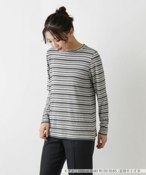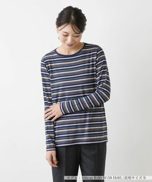 表情豊かなマルチボーダーが彩るクルーネックカットソー。ネックラインは程よく開きをもたせており、絶妙なバランスの抜け感を演出。優しい風合いのレーヨンベースの生地にはストレッチが効いているので肌当たりも快適。すっきりとしたシルエットが身体のラインを美しく整え、一枚でのスタイリングはもちろん、ジャケットやコートのインナーとしても重宝する汎用性の高いアイテムです。