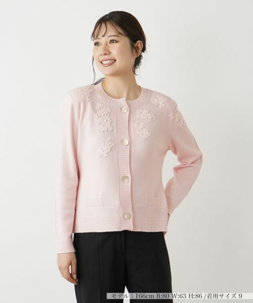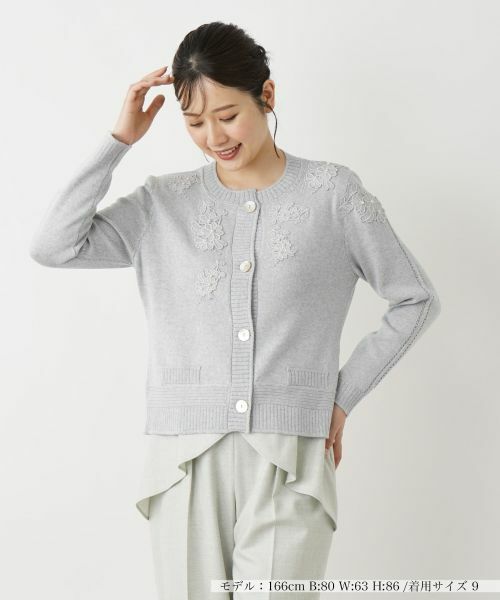 パール調ビジューのボタンをあしらったフラワーモチーフや大きめの貝調ボタンがエレガントな存在感を発揮するカーディガン。袖にはライン状のレースを縫い付け、細部までこだわりが感じられるアクセントをオン。ネック周りや前立て、袖口や裾周りのアウトラインはリブで切り替え、メリハリの効いた表情に。心地よく寄りそうようなすっきりとしたシルエットで着こなしやすく、ひと味違ったコーディネートが楽しめる一枚です。