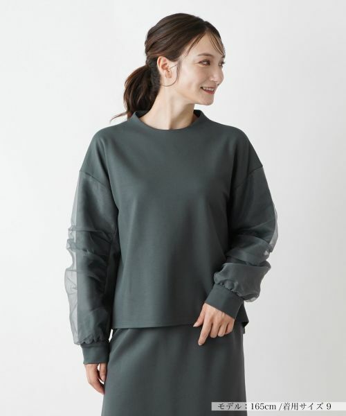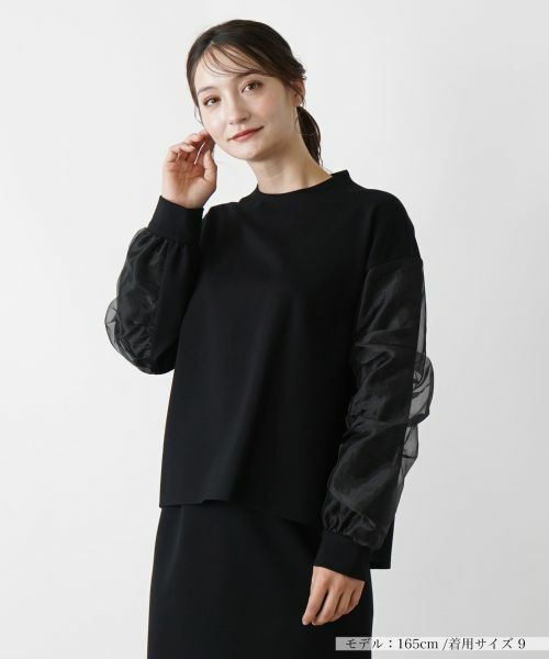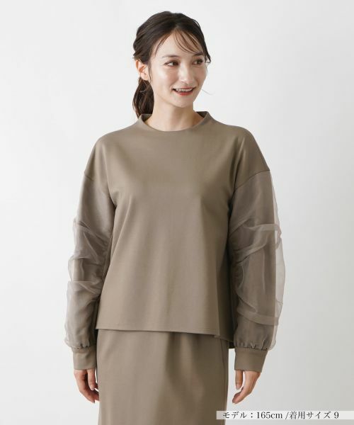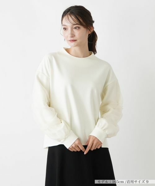 ボリュームスリーブにシアー素材をプラスし、インパクト溢れるデザインで仕上げたハイネックプルオーバー。高さのあるネックラインがデコルテを品よくカバー。ゆったりとしたドロップショルダーで気軽に着こなせ、ストレスフリーの快適な着心地を実現しています。統一感のあるカラーリングでアウターやボトムスとも合わせやすく、同素材のスカートとのセットアップ風コーディネートもおすすめです。