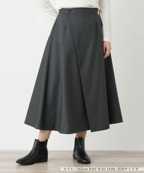落ち着いた色合いを基調とし、レトロシックな趣のピンストライプが表現されたロング丈のラップスカート。巧妙に切り替えを取り入れることで、デザインに変化を生み出しています。シルエットはウエストを程よくシェイプしつつ、裾に向かって大胆に広がりをもたせたAラインで大人の女性らしい雰囲気に。バックウエストはゴム仕様で心地よくフィットします。内側のラップ部分には隠しボタンが施されています。