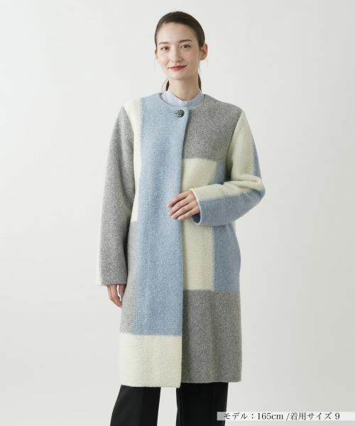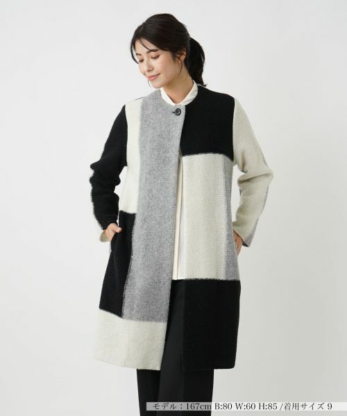 起毛感のあるニット素材で仕立てた、モンドリアン柄を思わせるグラフィカルなカラーブロックデザインのノーカラーコート。フロントは比翼仕立てですっきりとした印象に。身体のラインを拾いにくく、ヒップまで隠れる丈感でナチュラルに体型カバーできるのも嬉しいポイント。前ウエスト左右にはシンプルなスリットポケットをバランスよくレイアウトしています。ひと味違ったインパクトのあるアウタールックに仕上がり、さりげなくセンスを引き立てる一着です。