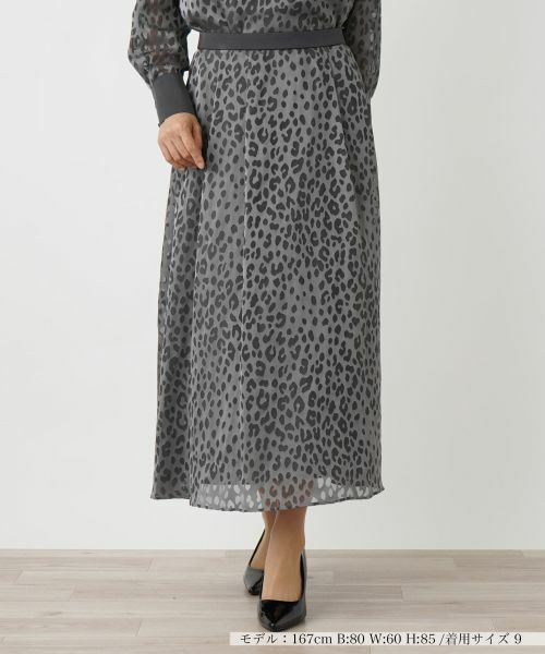 巧妙なバランスでタックを施した、透け感のあるレオパード柄のフレアスカート。ゆったりとしたロングシルエットで、動くたびに揺らめく裾がエレガントな雰囲気を引き立てます。バックウエストはゴム仕様で心地よくフィット。落ち着いた色使いでトップスともコーディネートしやすく、タックインすれば脚長見せのスタイルアップ効果も狙えそうです。サイドホック&ファスナーにより開閉が可能。