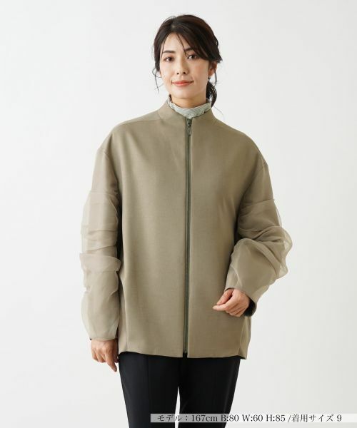 ふわりとしたシアー素材を重ねた、ボリュームスリーブがひと味違ったインパクトを放つハイネックジャケット。シルエットには程よくゆとりをもたせ、肩肘張らないリラクシーな雰囲気に。裾周りにタックを施すことでバランスよくデザインしています。フロントはジップアップ仕様でスムーズに着脱が可能。統一感のあるカラーリングでインナーやボトムスともコーディネートしやすく、着回し力に優れたアウターです。------------------------------------着用シーズン:冬伸縮性:なし透け感:なしポケット:あり生地の厚さ:やや厚手裏地:あり-------------------------------------※商品の色味は、撮影場所や光のあたり具合、お客様のお使いの機器により色味が違って見える場合がございます。予めご了承ください。家庭洗濯不可漂白不可タンブル乾燥不可アイロン低温120℃まで石油系溶剤ドライクリーニング弱ウェットクリーニング不可