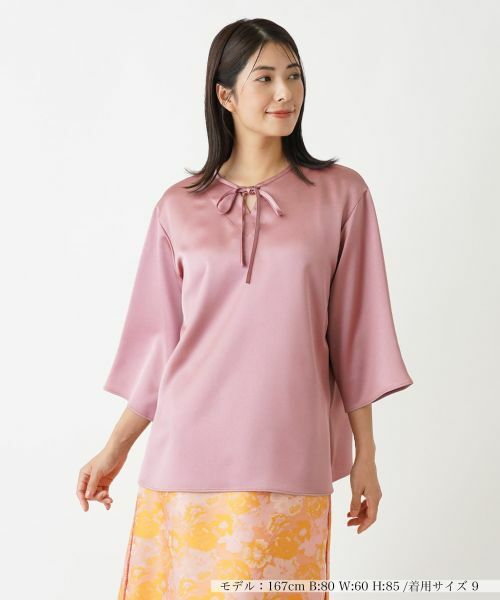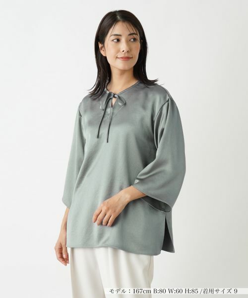 微光沢感のあるファブリックを使用し、リラックスシルエットでデザインしたクロップドスリーブのオーバーブラウス。細リボンがほんのりフェミニンなエッセンスに。ヒップまで隠れる程度の丈感でナチュラルに体型カバーできるのも嬉しいポイント。フロントネックや後ろ身頃の涙あきが絶妙なバランスの抜け感を演出。パンツ、スカートを選ばずに合わせやすく、着回し力に優れたトップスです。