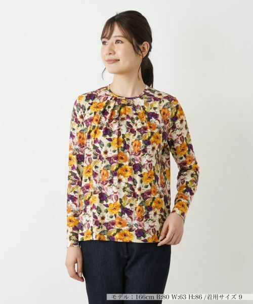 カラフルな色彩で描かれた絵画のようなフラワープリントが印象的なクルーネックカットソー。ネック周りに放射状に施されたタックが優雅で柔らかな表情を生み出し、着る人に上品さをプラス。レーヨン素材にストレッチを加えたしなやかな生地は、肌に心地よくフィットし、快適な着心地をキープ。すっきりとしたシルエットでボトムスを選ばず、幅広いコーディネートに対応できるのも魅力です。デイリーからちょっとしたお出かけまで、あらゆるシーンで活躍する一枚。