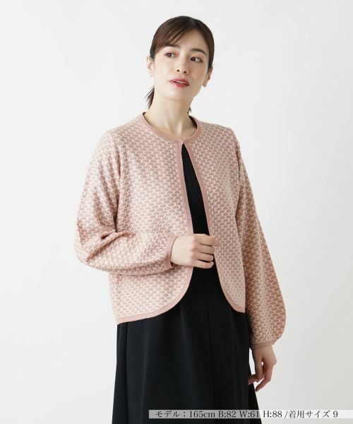 オプティカルな模様が視線を集める、ボレロ風デザインのカーディガン。ゆったりとしたボリュームスリーブが、動きやすさとリラクシーなムードを引き出し、ラウンドヘムが柔らかなニュアンスをプラス。首元はホック留め仕様で、すっきりとした印象をキープしつつ簡単に着脱可能。ロングワンピースに重ねることで、上級者らしいレイヤードスタイルが完成し、カジュアルからエレガントなシーンまで幅広く活躍する一枚です。------------------------------------着用シーズン:冬伸縮性:あり透け感:色によりありポケット:なし生地の厚さ:やや薄手裏地:なし-------------------------------------※商品の色味は、撮影場所や光のあたり具合、お客様のお使いの機器により色味が違って見える場合がございます。予めご了承ください。家庭洗濯不可漂白不可タンブル乾燥不可アイロン低温120℃まで石油系溶剤ドライクリーニング弱ウェットクリーニング不可