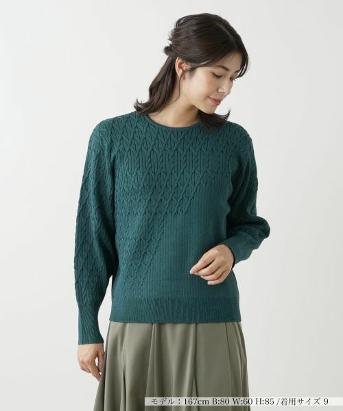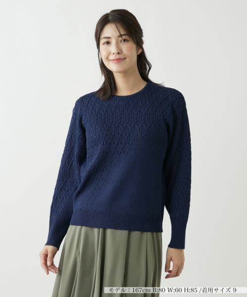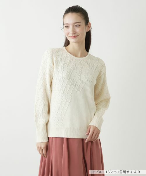 立体感のある個性的なケーブル編みで格子柄を表現したクルーネックニット。編み目が際立ち、視覚的な奥行きを生み出すデザインが特徴で、シンプルながらも存在感を放ちます。シルエットは程よくゆとりを持たせ、リラックス感のある快適な着心地を実現。カジュアルな日にはワイドパンツでラフにまとめるのはもちろん、フレアスカートを合わせれば、大人のフェミニンなスタイルが完成。オンオフ問わず活躍し、多彩なコーディネートに対応できる一枚です。