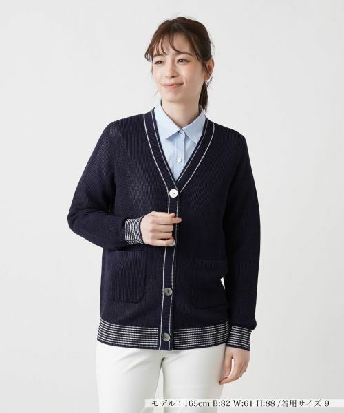 程よいゆとりのあるリラックスシルエットのVネックカーディガン。軽量で柔らかな素材感ながら、肌当たりがよく優しい温もりを伝えます。ラメ混のボーダーやラインディテール、貝調ボタンのさりげないアクセントが効いており、シンプルな中にもお洒落心が薫るデザインに。デニムやワイドパンツでまとめてカジュアルに仕上げたり、フェミニンなスカートを合わせたり、ブラウスなどのインナーとのレイヤードスタイルも自在に楽しめる一枚です。