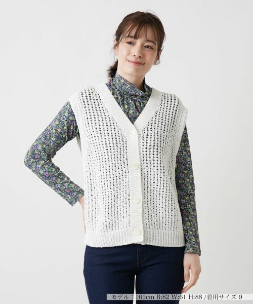 透かし編みが軽やかな印象を与えるニットベスト。バックスタイルは大きめの貝調ボタンがあしらわれ、意外性のあるデザインに。前後を逆にすることでクルーネックとVネックで楽しめる2way仕様となっています。シルエットには適度なゆとりがあり、合わせるインナー次第でさまざまなスタイリングが完成します。季節を問わず活躍する汎用性の高いアイテムは、オフィスカジュアルから休日のリラックススタイルまで幅広いシーンで活躍間違いなしです。