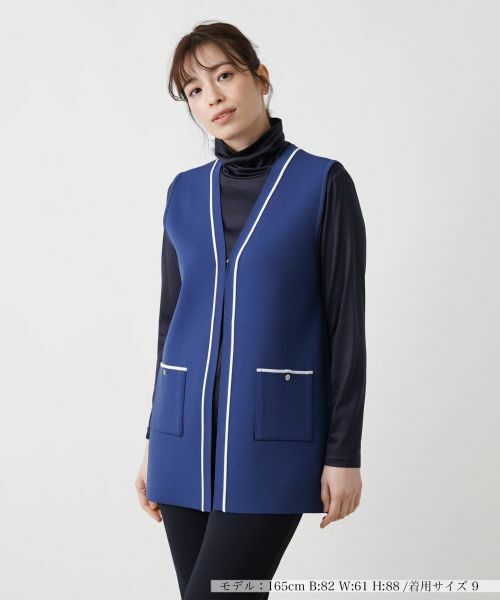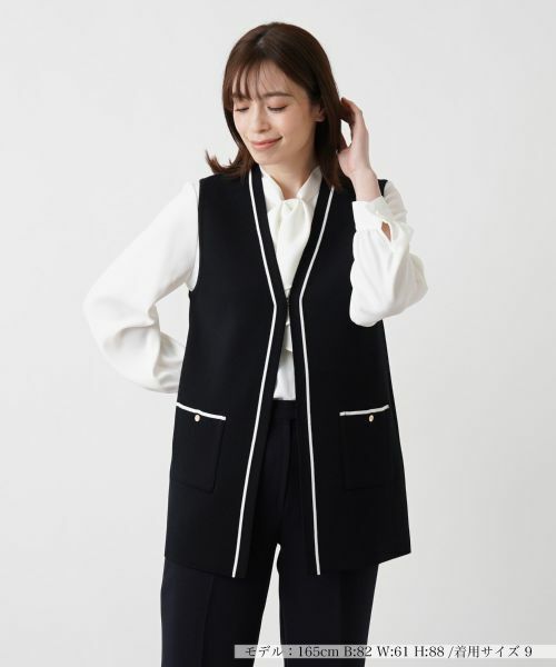 配色トリミングが目を惹く、スタイリッシュなデザインのベスト。シンプルながら、配色が程よいアクセントとなり、コーディネートにさりげないおしゃれをプラス。さらにシャープなVネックがすっきりとした印象を与え、顔周りを明るく引き立ててくれます。フロントはホックにより開閉が可能。軽量で柔らかな素材感が心地よい着用感を実現し、インナーとの重ね着に最適です。カジュアルなデニムにはもちろん、シャツやスラックスと合わせればオフィスにもぴったりです。