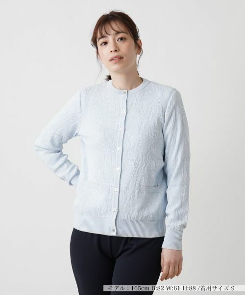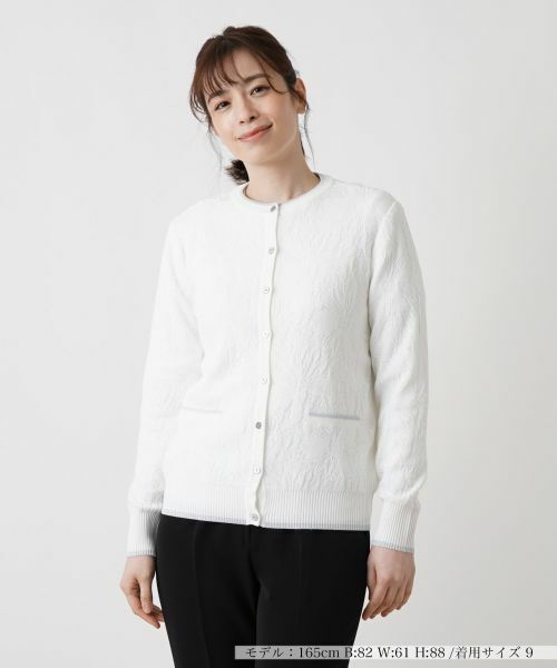 レースのような繊細なフラワー柄が女性らしい上品な印象を与えるカーディガン。裾や袖口にはラメが煌めき、リュクス感を漂わせるエッセンスに。ロングスリーブながら程よい透け感があり、重たさを感じさせず、インナー次第でシーズンを通して活躍するアイテムです。ポケット風のデザインもさりげないアクセントに。多彩なボトムスと相性がよく、カジュアルなデニムと合わせて抜け感のあるコーディネートに仕上げたり、タイトスカートやスラックスでエレガントなスタイルを楽しむことも可能。