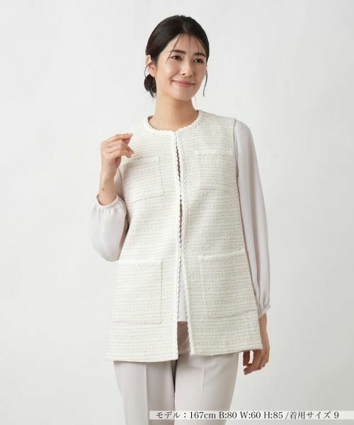 味わい深いツイード生地で仕立てられた、上品な存在感が光るセミロングベスト。ツイードならではの立体的な質感と繊細な表情が、シンプルなコーディネートにも華やかさをプラス。フロントにはスクエアポケットをバランスよくレイアウトし、実用性とデザイン性を両立しています。ヒップまでしっかり隠れる丈感で、ナチュラルに体型をカバーしてくれるのも嬉しいポイント。ほどよいフィット感と直線的なラインがスタイリングを引き締め、すっきりとした印象を演出します。