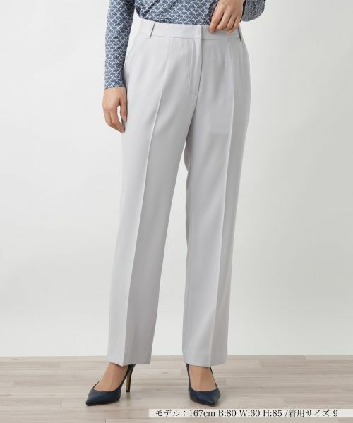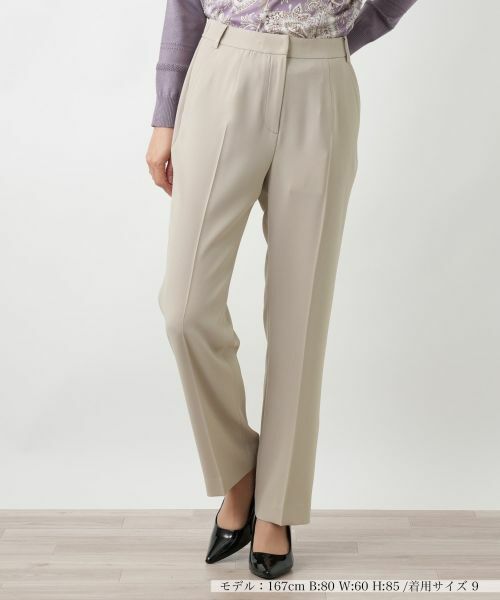 程よいハリ感としなやかさを備えた、ベーシックな無地デザインのセンタープレスパンツ。きちんと感を漂わせるセンタープレスが脚のラインをまっすぐに引き立て、スタイリッシュで洗練された佇まいを演出。ストレートシルエットに仕上げることで様々な体型にフィットしやすく、はくだけですっきりとした印象を与える一本。シャツやブラウスを合わせてオフィスやフォーマルなシーンに活用するのはもちろん、カットソーやニットと合わせれば、カジュアルながらもきちんと感のある大人の着こなしが完成します。