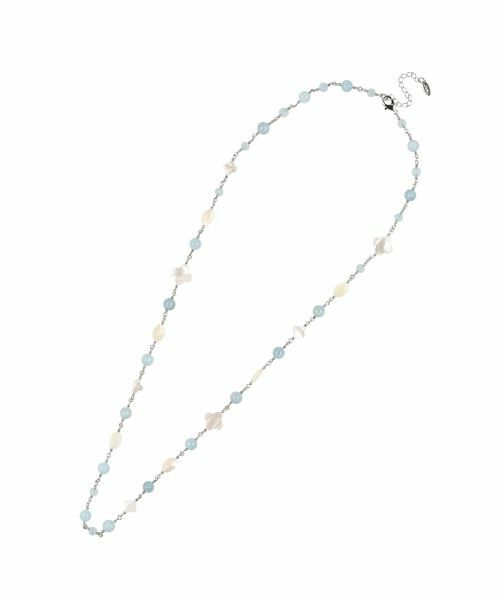アクアマリンに蝶貝や真鍮を組み合わせた、繊細でありながら存在感のあるモチーフが魅力のロングネックレス。優しい輝きを放つアクアマリンが、穏やかで洗練された印象を与え、蝶貝の上品な光沢と真鍮の温かみのある質感も相俟って絶妙なハーモニーを奏でます。ナチュラルなテイストのチュニックやワンピースと好相性で、旬のフェミニンルックを格上げし、エレガントな雰囲気を演出します。