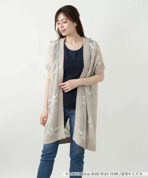 スパンコールが煌めくリーフ柄が印象的なニットベスト。ざっくりと編まれた風合いがナチュラルな抜け感を生み出し、程よいルーズさのあるシルエットが大人のリラックスムードを演出。肩周りを優しく覆うワイドなショルダーラインが特徴で、さっと羽織るだけでこなれ感のある着こなしに。気になるボディラインをカバーしつつ、縦長のシルエットがスタイルアップ見せ効果も叶えます。フロントはノーボタン仕様ですっきりとしたデザインに仕上げており、インナーとのレイヤードも楽しめます。