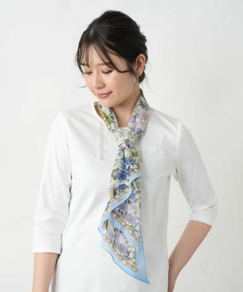 アーティスティックなフラワープリントが印象的なスカーフ。繊細なラインや色彩が描き出す花々が、コーディネートに上品な華やぎを添えます。軽やかな薄手の生地を使用しており、ほんのりとした透け感が涼やかなニュアンスを演出。さらりとした肌触りで心地よく、季節を問わず活躍してくれる一枚です。首元に巻いてアクセントにするのはもちろん、バッグのハンドルやベルトループに結んでスタイリングのポイントにするのもおすすめ。