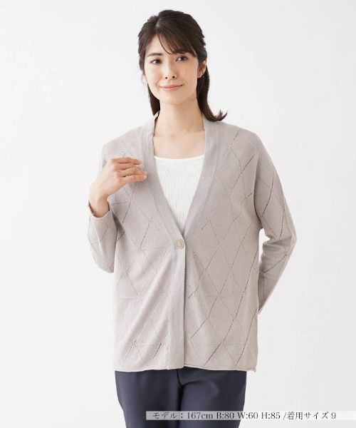 ダイヤ状の透かし柄がシーズンらしい軽やかさを演出するVネックニットカーディガン。ゆったりとしたサイズ感だから、程よく力の抜けた着こなしに仕上がります。麻とコットンをブレンドした素材で着心地はさらりと爽やか。※定価(税込)は、2022年06月29日のセール開始前の店舗における販売価格です。 家庭洗濯不可漂白不可タンブル乾燥不可アイロン低温210℃まで石油系溶剤ドライクリーニング弱ウェットクリーニング不可