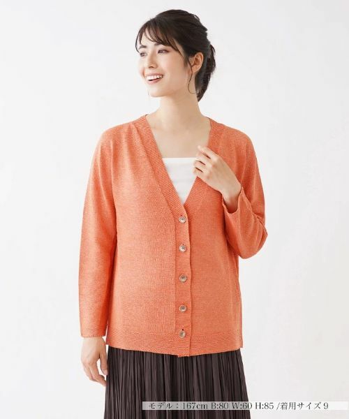春夏スタイルにぴったりの爽やかな素材感が心地いいVネックカーディガン。ややゆとりのあるシルエット&無地デザインで、バツグンの着まわし力を発揮。パンチの効いた柄ボトムスと難なく合わせられる1着です。