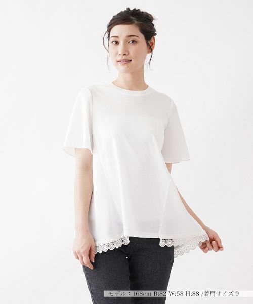 ボディラインを拾わずキュートに揺らめく、フレアシルエットの半袖カットソー。ヘムにトッピングした繊細なレースが、スタイリングを愛らしく彩るアクセントになってくれそう。しなやかな素材感で着心地もバツグンです。