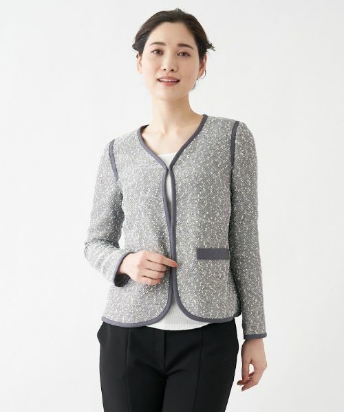 ポケットや前立て、袖などを飾る配色のパイピングが軽やかなアクセントになってくれるジャケットです。やや細身のシルエットが美しく、清楚で上品な着こなしに仕上がります。前立てのVネックラインが、首回りをすっきりと華やかな印象に見せてくれるのも嬉しいポイント。