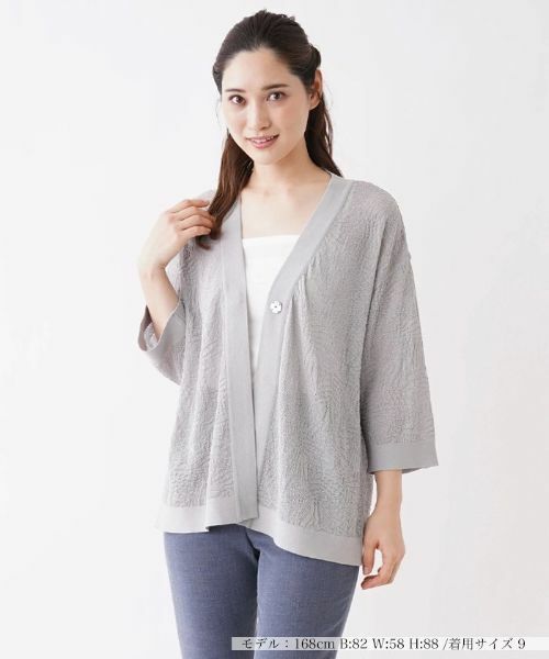 これからの季節らしいボタニカル風のレリーフ柄が浮かぶ7分袖カーディガン。ネックラインは深めに開き、袖はドロップショルダーで落ち感をもたせ、絶妙なバランスの抜け感を生み出しています。フロントを開け放って羽織っても、こなれ感のある着こなしに。