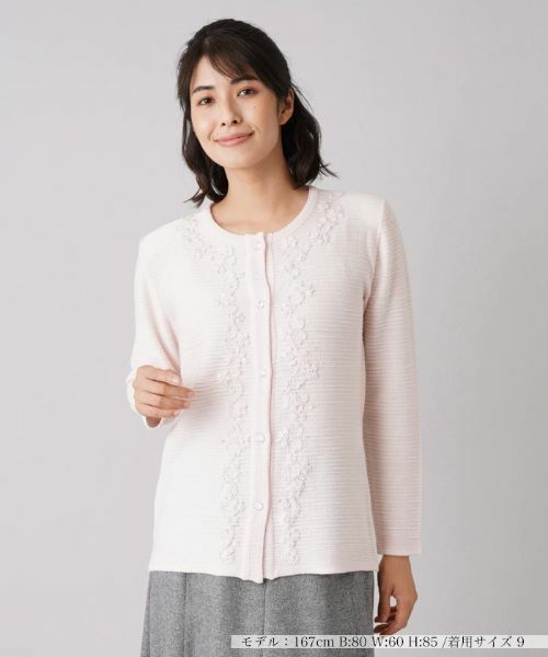 素材をざっくりと編み込んだ、すっきりとしたシルエットのクルーネックカーディガン。ネック周りからフロント、裾にかけて施したフラワー刺繍やビーズ使い、ビジューボタンが華やかなエッセンスに。カットソーとのレイヤードスタイルやロングスカートともコーディネートしやすく、ワンランク上のエレガントなフェミニンルックが楽しめるアイテムです。