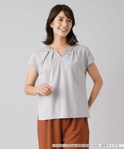 ネックラインをビジューでデコレーションすることで、さりげなくエレガントな魅力をアピールする1着に。ボトムスを問わない無地デザインは着まわし力も◎。
