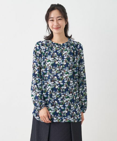 これからの季節らしい多色感のある小花柄をプリントしたチュニックブラウス。凹凸感のあるジョーゼット素材なので肌触りも滑らか。ネック周りにタック&ギャザーを施し、袖と身頃に適度な膨らみをもたせて女性らしいやわらかなニュアンスに。やや長めの丈感とリラックスシルエットで着心地も快適。ネック中央のボタンで着脱しやすくなっています。裾をインしてもアウトしても着ていただけるアイテムです。